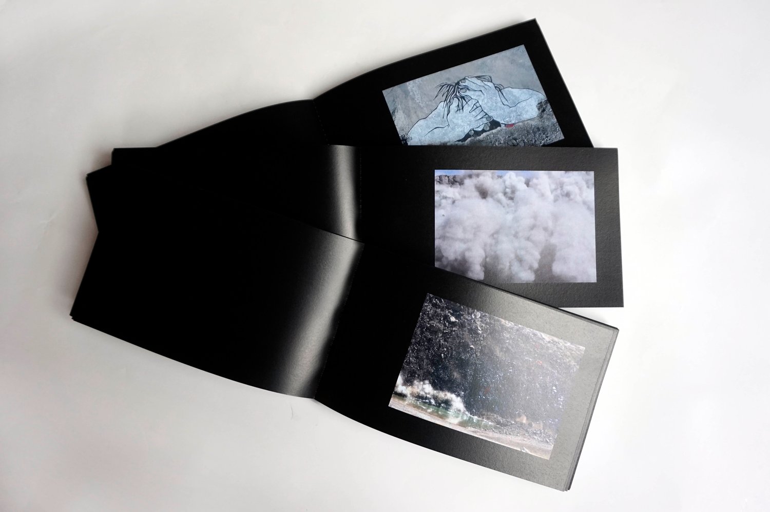 3 dessins géants qui disparaissent dans une explosion de pierres sous forme de livres d'images, qui, feuilletés rapidement et en continu avec le pouce, donnent l'impression de séquences animées.